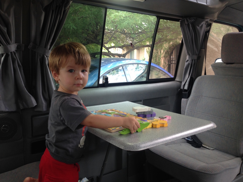 We finally had rain the other day so it was a rather pleasant morning in the desert to be outside. The bus itself provides a great playpen, so I popped the top and my little helper immediately jumped in and took over "driving" and doing a puzzle.