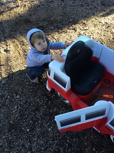 My toddler got a Roleplay 6V VW bus for Christmas from his Grandma and Grandpa. There are lots of VW busses in the family now, but I think this is the smallest. And the easiest to get stuck.