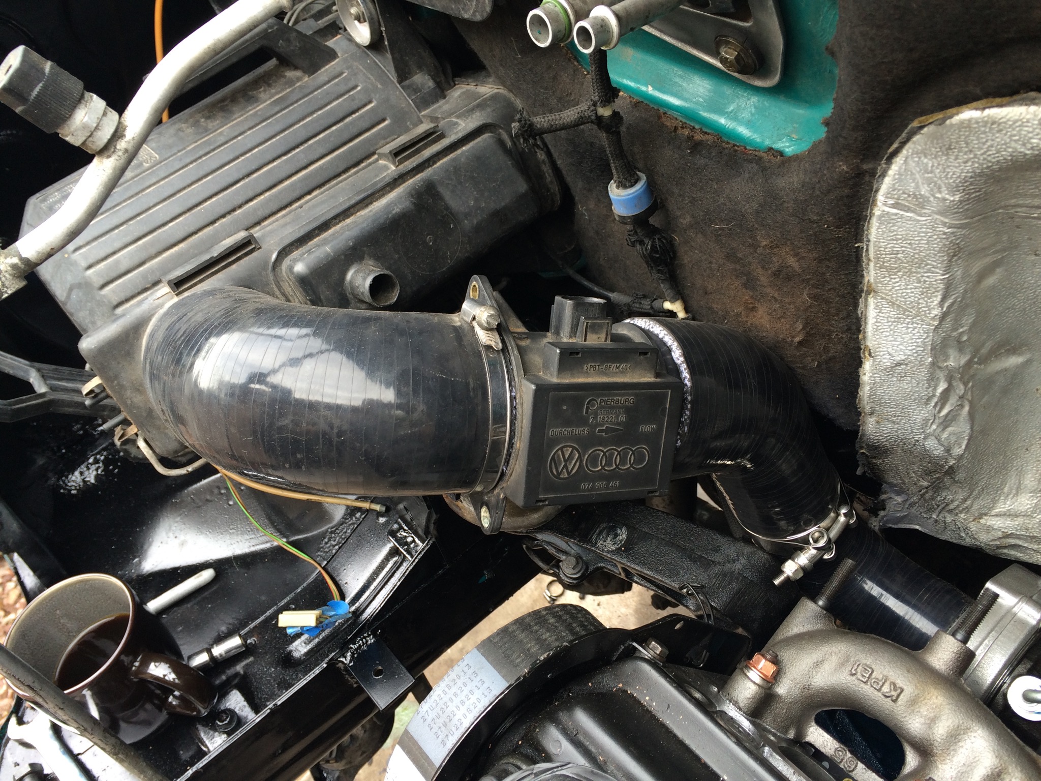While the thing is huge, I opted to retain the factory airbox. There is already mounting available from the factory and it's in a convenient location with regard to the turbo. If it's able to reasonably support five cylinders at 5000 rpm (7500 g/min) it will be comparable a 1.9l four-cylinder at 3500 RPM (~8000 g/min at 15psi boost). Plus I get to keep the cool over-engineered airfilter change handle.