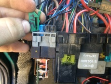 The black wire coming from the 4x1 connector terminates in a green single plug that needs to connect to TV5. TV5 is another four-place jumper block on the fuse box deriving its power from D/11. Luckily it's present on the Eurovan on the left side and one place is open. Cruise now has power.